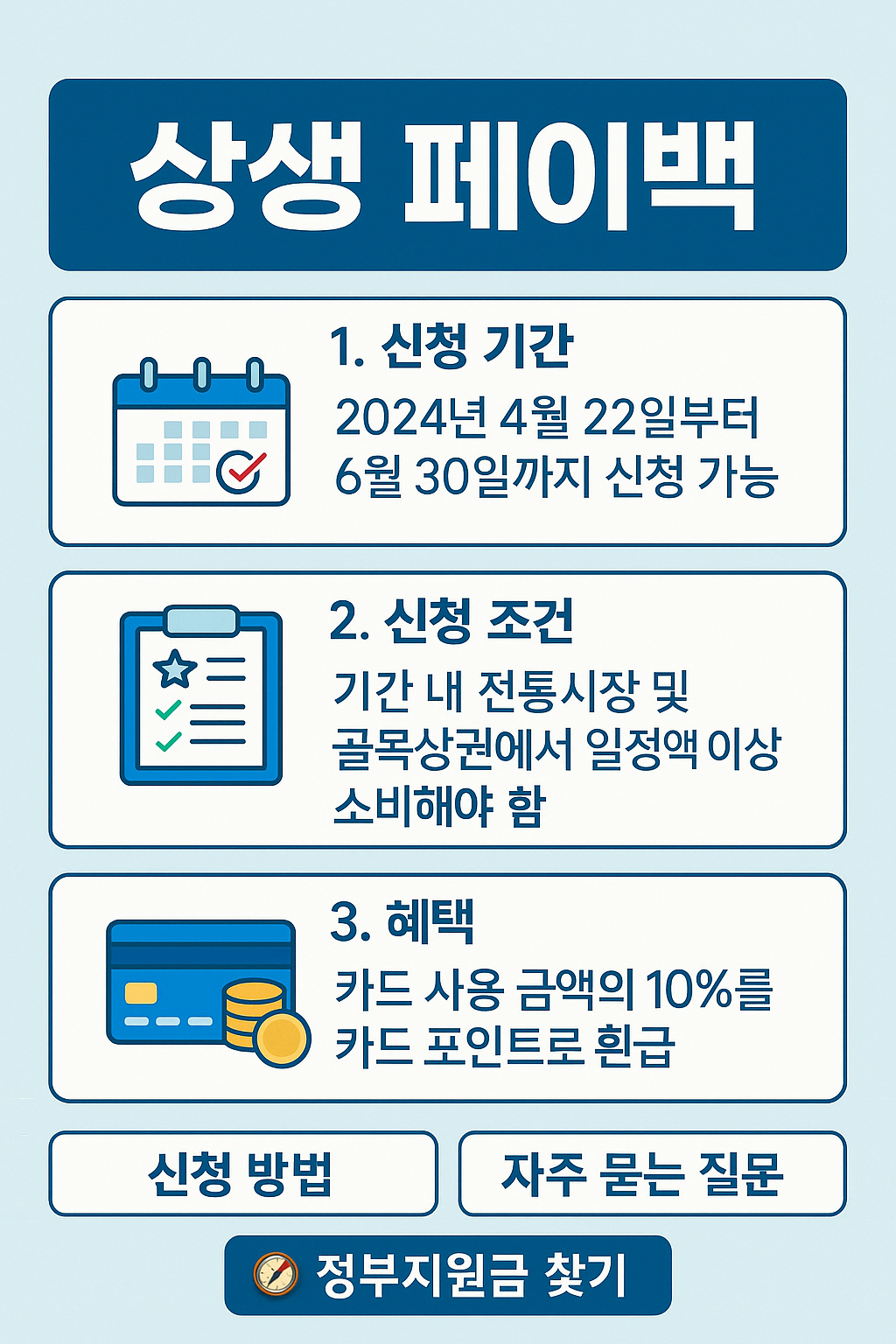 상생페이백은 가계의 생활비 절감과 동시에 지역 경제 회복을 돕는 제도입니다. 하지만 모든 업종이 인정되는 것은 아니므로 반드시 가맹점을 확인해야 하며, 월별·분기별 환급 한도를 체크해야 합니다.